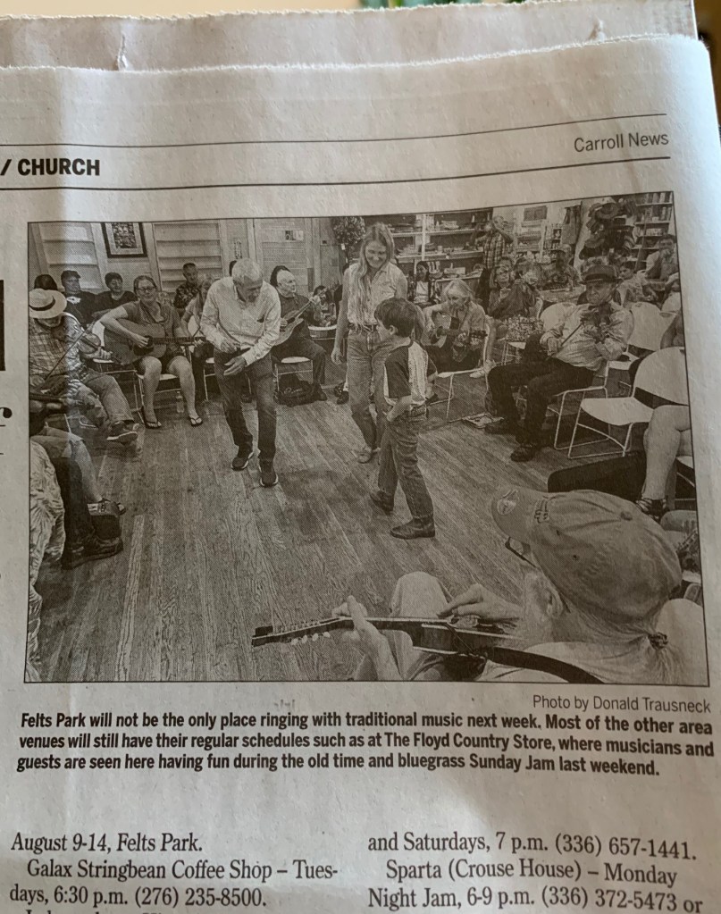 The 85th Old Fiddlers’ Convention, held at Felts Park for six nights was expected to draw 50,000 to 60,000 people from all fifty states and several foreign countries. The paper reported the big controversy over face masks in schools, but there was no debate at the convention; no one wore a mask.