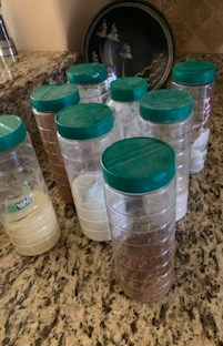 In Florida you need a canister for everything. The containers for Parmesan cheese, are now filled with corn starch, corn meal, brown sugar, etc. A pretty box that came with who knows what, made a jewelry box with a pull out draw, great for travel. The cool whip container is as usable as any store bought reusable container for the refrigerator. The pink pump container is just too pretty to dump, and the pump pumps better than any one I’ve bought.