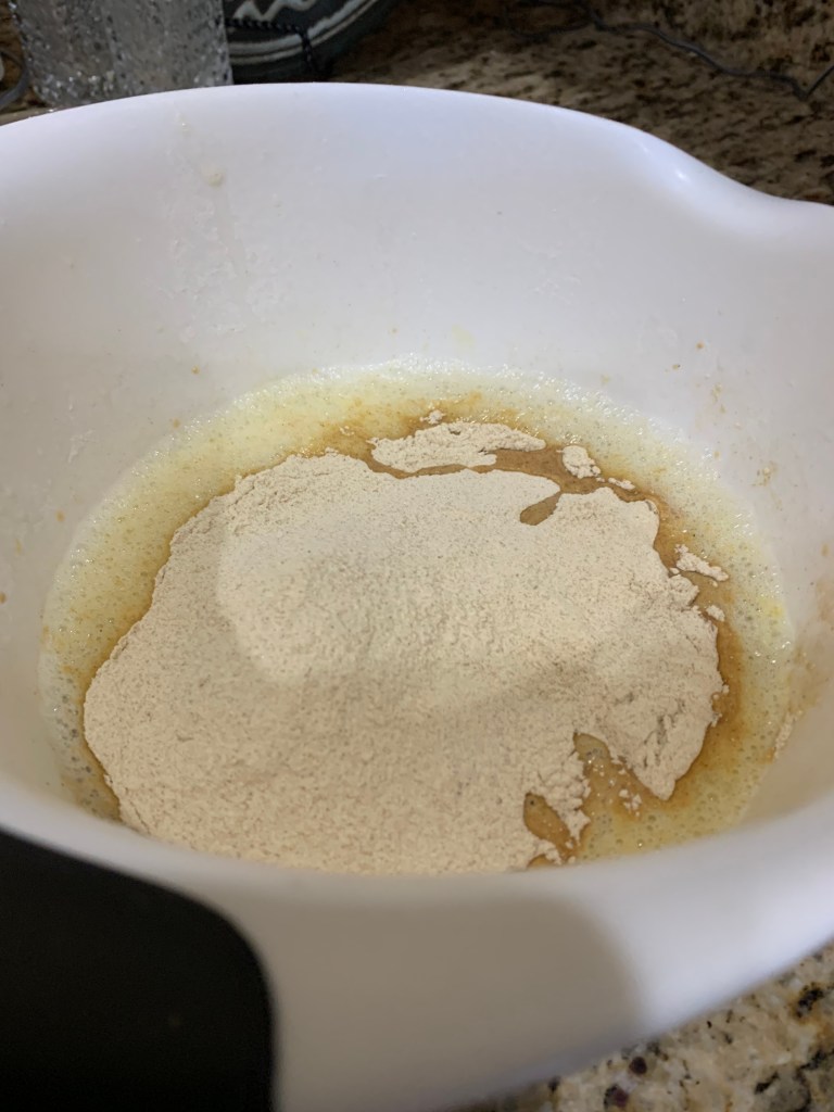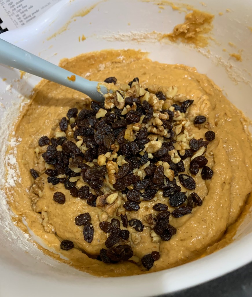 The chopping and measuring took time because I’m 75 years old and things. . .take time. I have to remember if I put in the baking powder in or not; and loose count of the cups of flour. Then need to be extra careful not to burn myself, etc., but it makes two loafs.