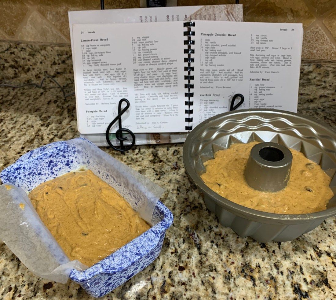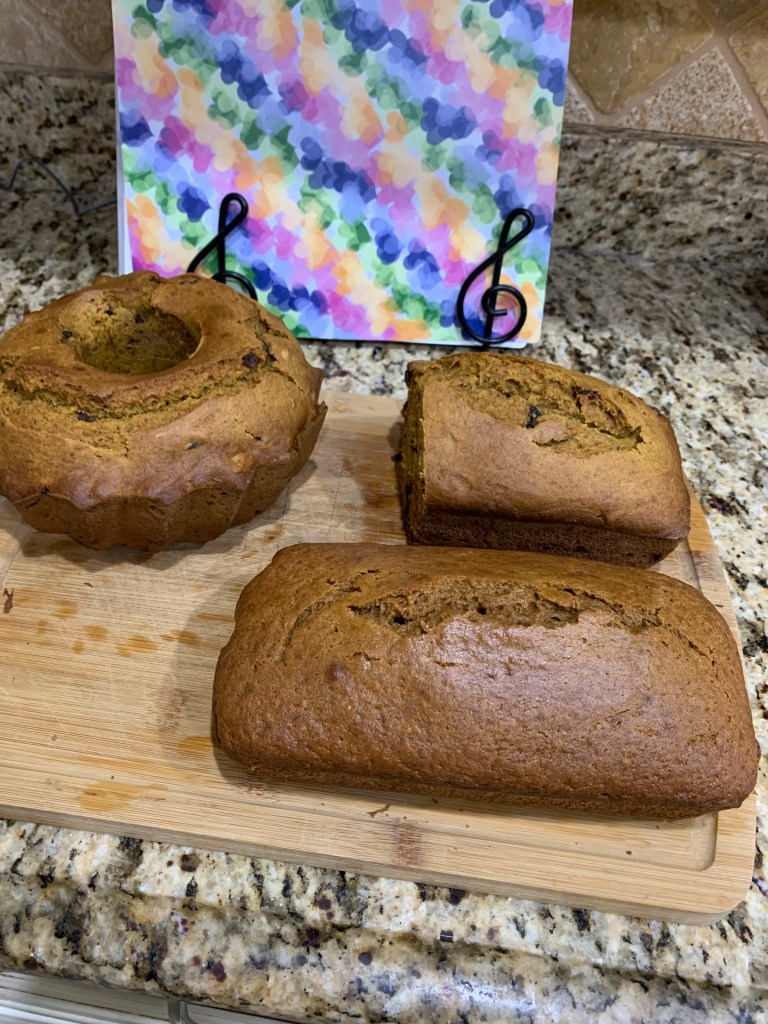 The temperatures have dropped in Florida and today, I wore a coat outside to enjoy my coffee in the dark at 6:45 A.M. I made pumpkin bread to celebrate. The recipe was from a Lafayette Cook Book published in 1995 as a fundraiser for the historical society. It called for two and two-third cups of sugar, too high for me, so I reduced the sugar to one cup. The reason I baked vs bought, was to control the sugar.